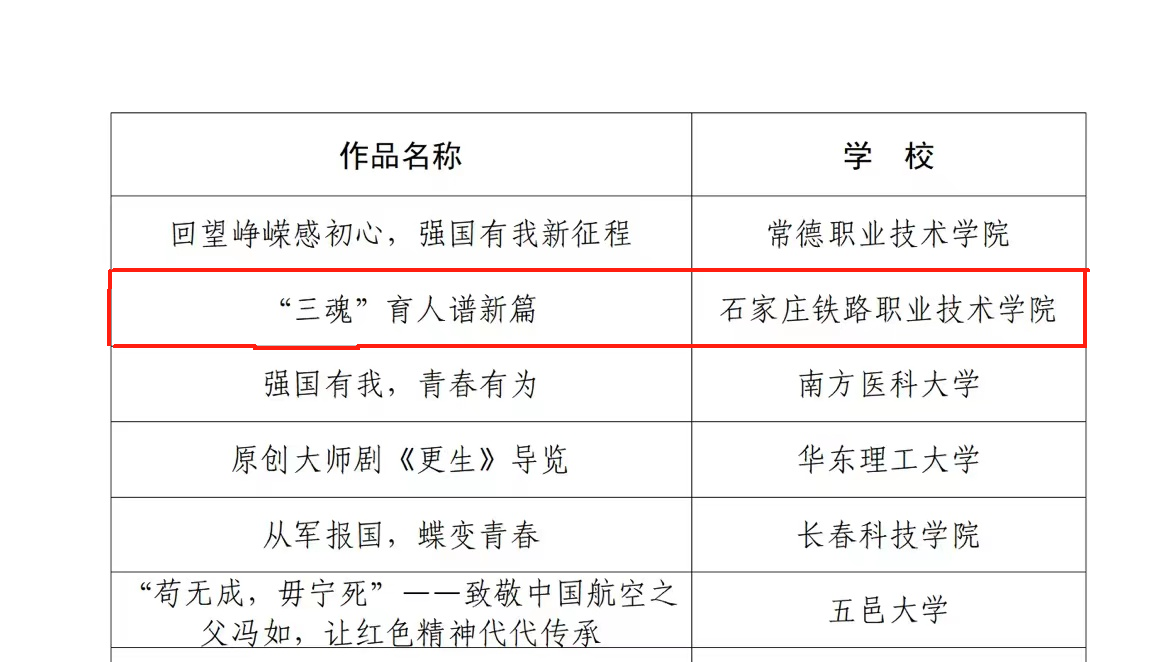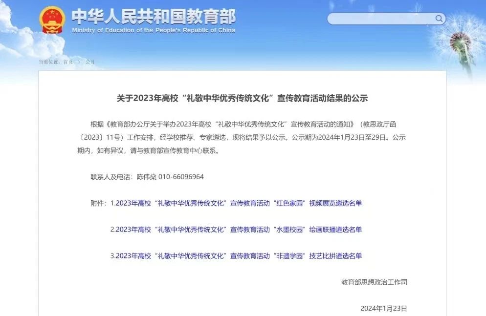 近日,教育部公示2023年高校“礼敬中华优秀传统文化”宣传教育活动结果,学院选送作品《“三魂”育人谱新篇》入选“红色家园”视频展览遴选名单。