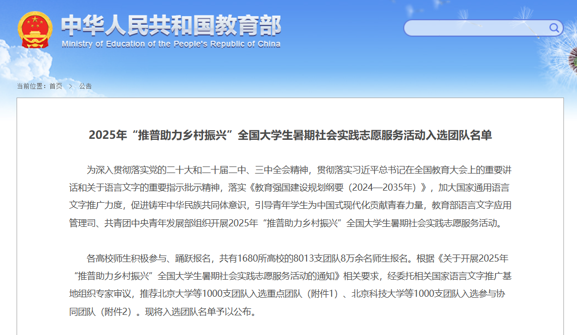 为深入贯彻落实党的二十大和二十届二中、三中全会精神,贯彻落实习近平总书记在全国教育大会上的重要讲话和关于语言文字的重要指示批示精神,落实《教育强国建设规划纲要(2024—2035年)》,加大国家通用语言文字推广力度,促进铸牢中华民族共同体意识,引导青年学生为中国式现代化贡献青春力量,教育部语言文字应用管理司、共青团中央青年发展部组织开展2025年“推普助力乡村振兴”全国大学生暑期社会实践志愿服务活动。